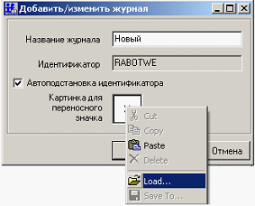 3) В открывшемся окне «Добавить/изменить журнал» (см. Рис. 9.14) на поле «Картинка для переносного значка» ПКМ активировать всплывающее меню и выбрать пункт меню «Load…» (см. Рис. 9.14).