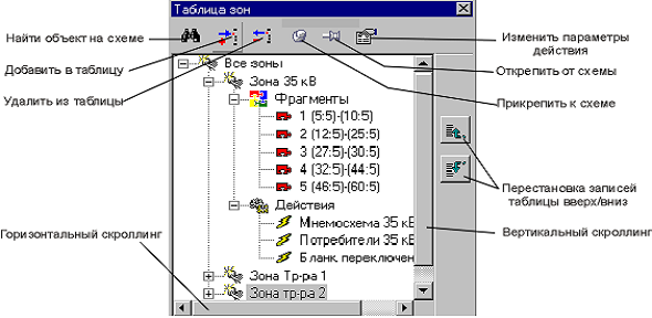 Для каждой мнемосхемы можно задать произвольное количество зон. Каждая из зон может состоять из прямоугольных фрагментов для псевдографических схем и объектов (элементов) векторных схем. Фрагменты одной зоны могут располагаться в произвольных местах мнемосхемы.