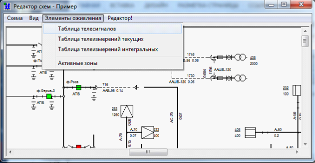 Оперативная схема для ‘оживления’ загружается редактором схем векторной графики (см. Рис. 7.24). Используя пункты меню «Элементы оживления» → «Таблица телесигналов» или «Элементы оживления» → «Таблица телеизмерений текущих» открывается окно ‘оживления’ схемы (см. Рис. 7.25)