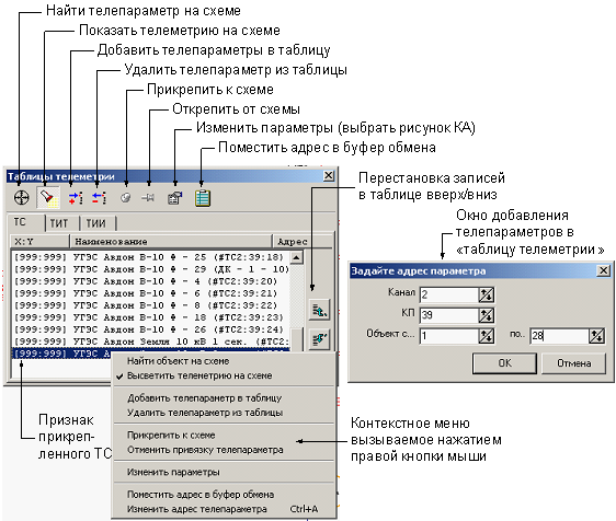 - прикрепление телепараметров из таблицы просмотра к элементам оперативной схемы;