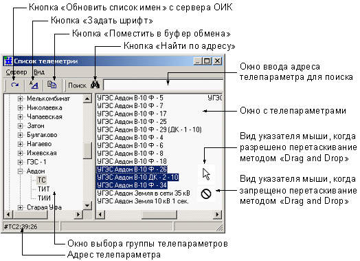 Окно со списком телепараметров можно использовать для переноса адреса и наименования выбранного телепараметра в другие приложения, используя буфер обмена. Для переноса необходимо: