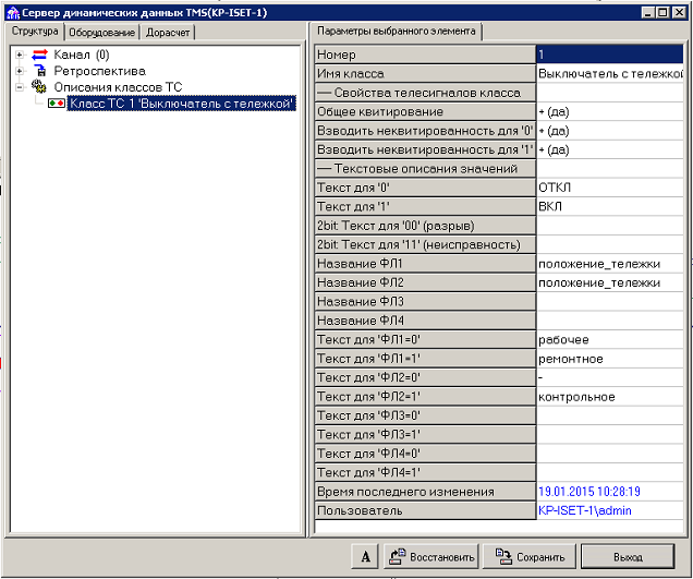 В «ОИК Диспетчер НТ» существует ограничение – нельзя обозначить более чем два состояния, характеризующих одно и то же свойство объекта. Например, положение тележки в редакторе МОДУС может иметь три состояния: ‘рабочее’, ‘ремонтное’ и ‘испытательное’. При описании класса ТС в «ОИК Диспетчер НТ» (Текст для флага =0 и =1) в этом случае можно выбрать только два, например, ‘рабочее’ и ‘ремонтное’. Для описания третьего состояния можно задействовать второй флаг.