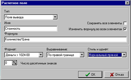 Допускается работа с массивами – многострочные поля ввода и вывода, данные которых обрабатываются по одной и той же формуле. Например, колонки – количество, цена и стоимость. Стоимость есть произведение количества на цену. Для описания такой таблицы достаточно описать две колонки полей ввода, каждая со своим идентификатором, а также одну колонку – поле вывода. Формула, по которой выполняются вычисления, вводится при описании колонки полей вывода один раз. Количество строк для всех трех полей должно быть одинаковым, а сами поля могут быть расположены в произвольных местах документа. Допускается вычисление по разным формулам для разных элементов многострочного поля вывода. Для создания расчётного поля: