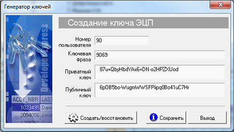 Для создания ключа электронной цифровой подписи (ЭЦП) в окне редактора пользователей следует ЛКМ нажать кнопку («Ключи электронной подписи»). В открывшемся окне (см. Рис. 9.19) ввести ключевую фразу (по которой будут созданы уникальные ключи) и нажать кнопку «Создать/восстановить». Ключи ЭЦП состоят из пары ключей открытый/закрытый. Закрытый ключ хранится в аппаратном ключе. Для сохранения ключей в аппаратном ключе нужно подсоединить его к последовательному порту и в этом же окне нажать кнопку «Сохранить».