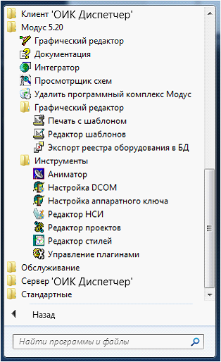 После установки ПО в меню запуска программ Windows добавляется задача - «Модус 5.20» со своим меню (см. Рис. 4.2).