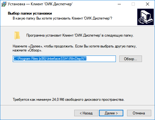 После проделанных действий произойдет распаковка файлов и откроется окно выбора каталога установки ПО. Поумолчанию папка, в которую устанавливается ПО клиента - C:\Program Files (x86)\InterfaceSSH\WinDispNT.