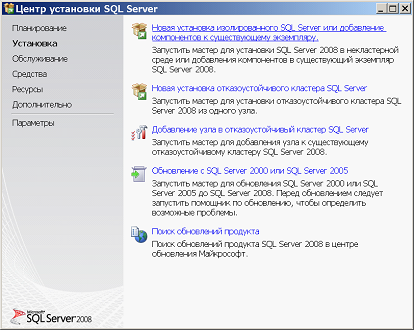 1) В окне «Центр установки SQL Server» в разделе «Установка» выбрать пункт «Новая установка изолированного SQL Server или добавление компонентов к существующему экземпляру».