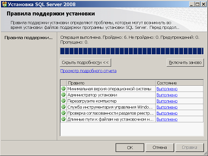 2) В окне «Правила поддержки установки» нажать кнопку «Показать подробности» и убедиться, что все проверки успешно пройдены. Если появятся «Правила» в состоянии «Не пройдено», то после устранения проблемы (описание можно получить, кликнув мышью на слове «Ошибка» в соответствующем правиле) еще раз запустить проверку кнопкой «Включить заново». Закрыть окно кнопкой «ОК».
