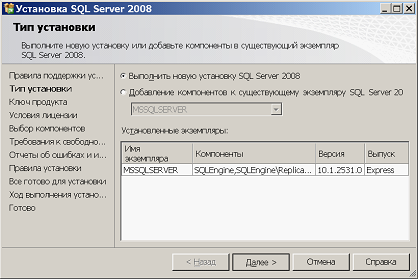 5) В окне «Тип установки» убедиться, что указан тип «Выполнить новую установку SQL Server 2008» и нажать кнопку «Далее».