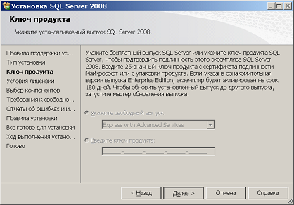 6) «Ключ продукта» для бесплатной версии SQL Server не требуется - нажать кнопку «Далее».