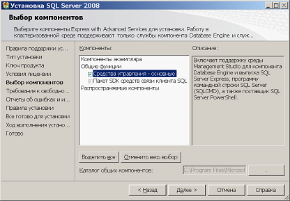 8) В окне «Выбор компонентов» в разделе «Компоненты» поставьте галочку для «Средства управления - основные» и нажать кнопку «Далее».