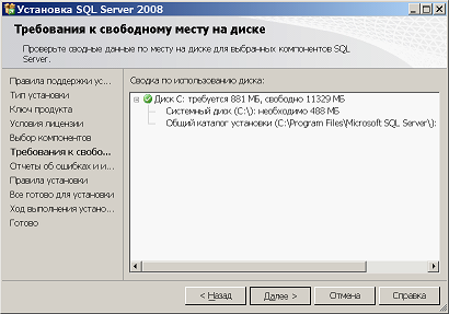 9) В окне «Требования к свободному месту на диске» убедиться в том, что свободного места на диске больше требуемого. В противном случае – освободить достаточное пространство. Нажать кнопку - «Далее».