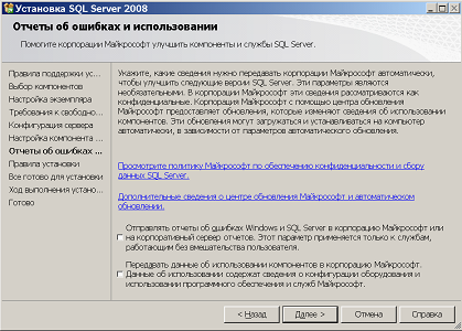 10) В окне «Отчеты об ошибках и использовании» оставить обе галочки снятыми и нажать кнопку «Далее».