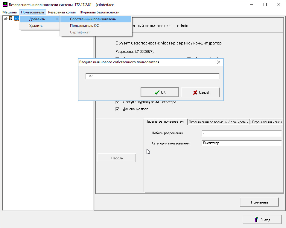 Для добавления пользователя необходимо выбрать пункт меню «Пользователь» - «Добавить» - «Собственный пользователь». В появившемся окне ввести имя пользователя. После внесения имя пользователя изменить пароль вновь созданному пользователю. Пароль вводить согласно используемой парольной политики