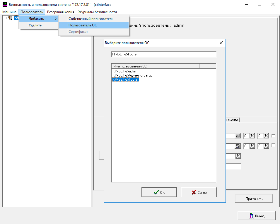 Для добавления пользователя необходимо выбрать пункт меню «Пользователь» - «Добавить» - «Пользователь ОС». В появившемся окне появится список с доступным списком пользователей компьютера. Для данного типа пользователя в ПО настройки безопасности пароль не устанавливается, соответственно не ограничивается парольными политиками ПО сервера «ОИК Диспетчер НТ».
