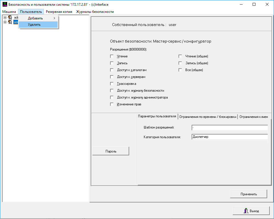 Для удаления пользователя необходимо выделить необходимого пользователя, выбрать пункт меню «Пользователь» - «Удалить».