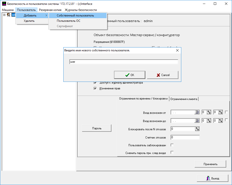 После изменения прав доступа учетной записи admin, необходимо произвести переподключение к серверу. При необходимости создания дополнительной учетной записи, рекомендуем воспользоваться инструментом добавления собственного пользователя, процедура создания пользователя продемонстрирована на рисунке. Так же можно добавить пользователей ОС. Подробно процедура добавления/удаления учетных записей рассмотрена в разделе 6.5.6.
