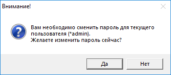 После первой авторизации появится окно - предупреждение о необходимости смены пароля. Процедуру смены пароля необходимо произвести обязательно. По умолчанию в комплексе установлена жесткая парольная политика (подробное описание доступно в разделе 6.5.5), поэтому вновь вводимый пароль обязательно должен содержать минимум 8 символов, одну строчную, одну заглавную букву и цифру. Пример пароля: Admin-123