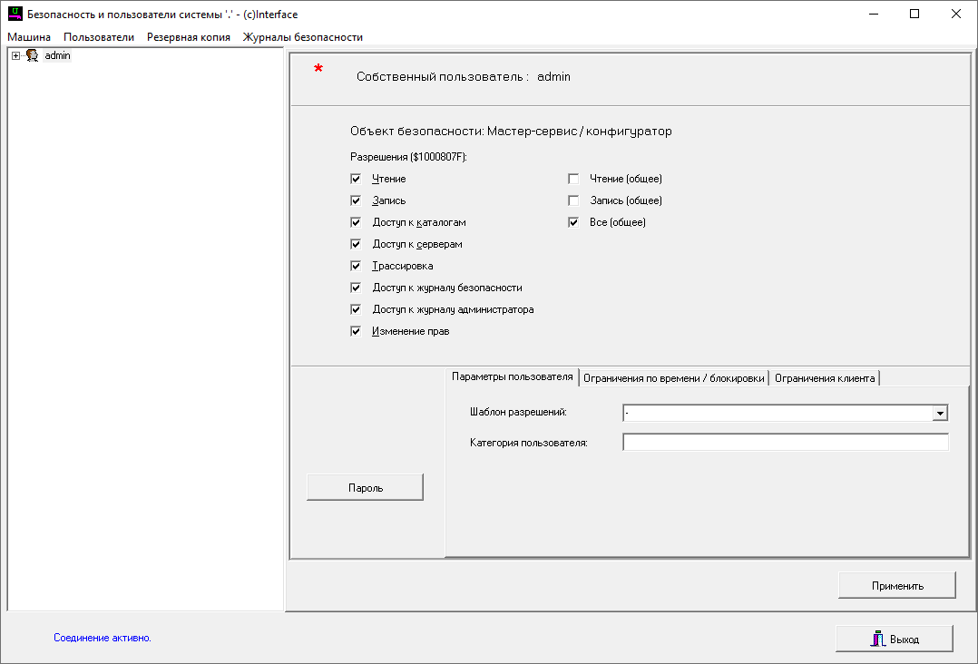 Учетная запись admin имеет особый статус. Данную учетную запись не рекомендуется удалять потому что, в случае отказа ключа защиты лицензии и запрета использования данного уровня безопасности, она останется единственной доступной для входа и управления системой.
