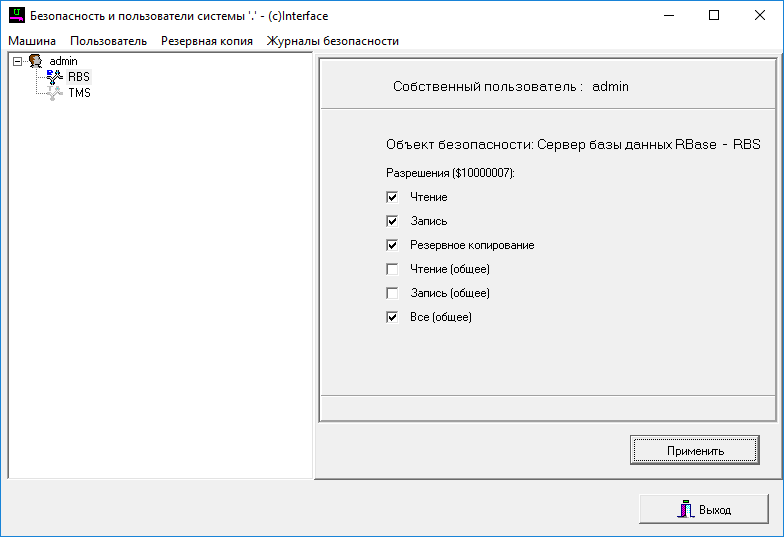 После запуска модуля безопасности необходимо предоставить соответствующие права доступа на уровнях: Master-сервис/Конфигуратор (доступ к ПО сервера), TMS и RBS-серверов. После каждого изменения прав необходимо нажать кнопку «Применить», красная звездочка в левом верхнем углу поля указывает на то, что произведенные изменения не сохранены.