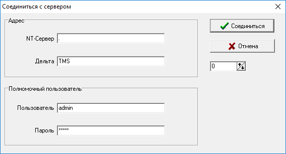 - выполнить соединение с удаленным компьютером (пункты меню «Дельта»→ «Соединиться»). В параметрах настройки соединения задать имя и пароль пользователя, который будет работать на удалённом компьютере со специальным ПО ИПЦ, пользователь должен обладать полным набором прав на уровне безопасности ПО «Дельта-монитор».