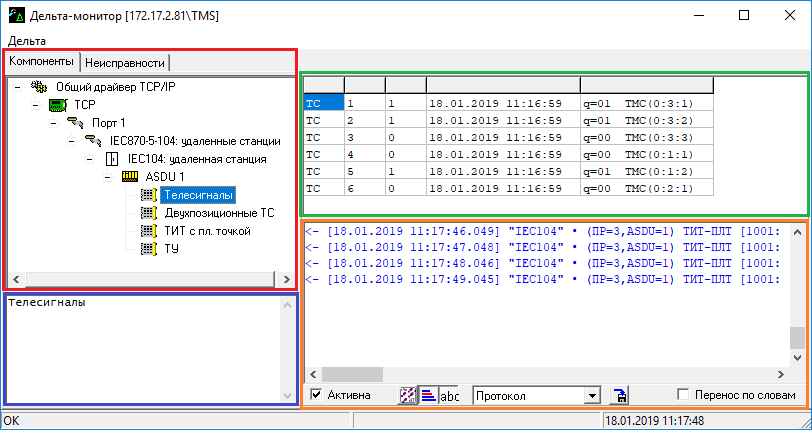 Панель просмотра программы «Дельта-монитор» на закладке «Компоненты разделена на четыре зоны: