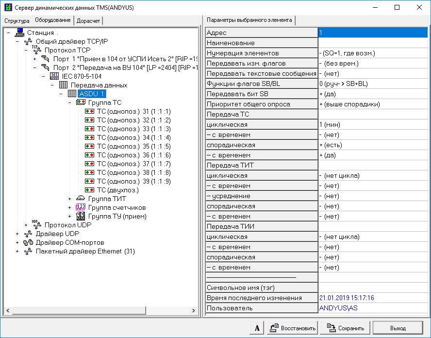Рис. А.3.2.2 Настройка сервера TMS (передача в протоколе МЭК 870-5-104)