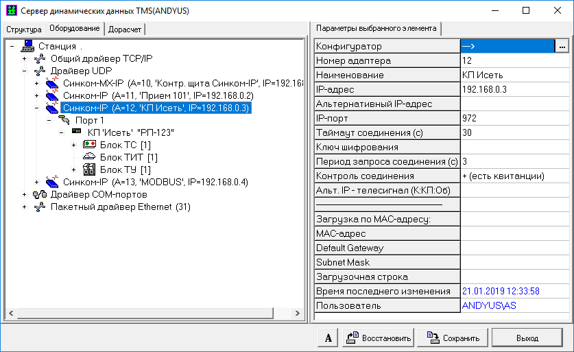На Рис. А.2.2.1 – Рис. А.2.2.3 приведен пример настроек сервера динамических данных (под именем TMS) при приеме телеметрии от КП «Исеть». Связь сервера с КП осуществляется в протоколе «Исеть (UDP)» по локальной сети Ethernet.