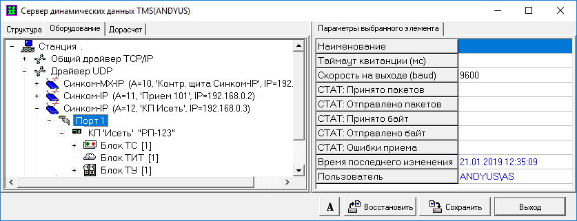 Рис. А.2.2.1 Настройка сервера TMS (протокол КП «Исеть (UDP)», см. раздел 14.2.3)