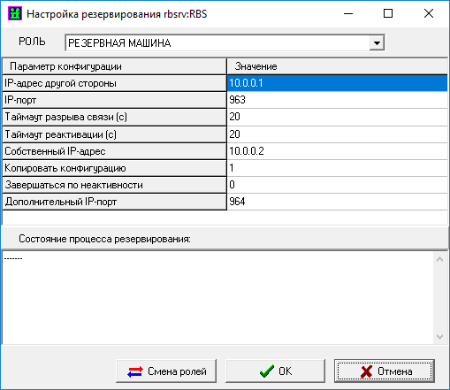 С помощью появившегося меню «Настройка резервирования» задать тип сервера (основной или резервный) и явно определить обязательные параметры настройки.