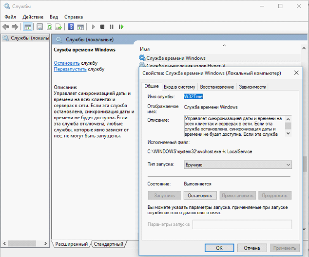 - установить типа запуска службы времени Windows – «Вручную» (кнопка «Пуск» -> «Компьютер» -> ПКМ «Управление» -> «Службы» -> «Служба времени», см. Рис. 15.3.1);