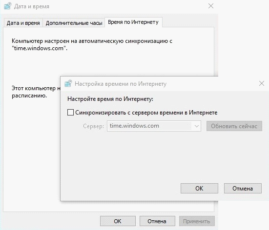 - отключить синхронизацию с сервером времени в Интернете (ПКМ на панели задач активировать контекстное меню и выбрать строку «Настройка даты и времени», в окне «Дата и время» выбрать закладку «Время по Интернету», ЛКМ на кнопке «Изменить параметры» открыть окно «Настройка времени по Интернету», удалить признак «Синхронизировать с сервером времени в Интернете», см. Рис. 15.3.2.