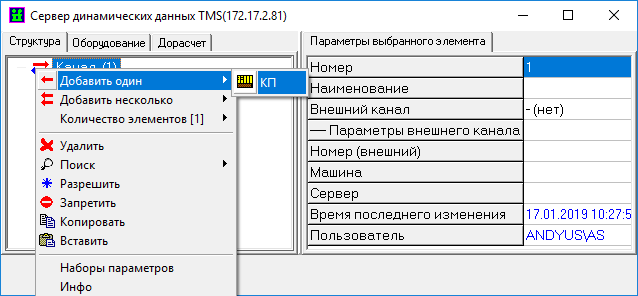 - открыть окно настройки структуры сервера динамических данных, выделить элемент «Канал»;