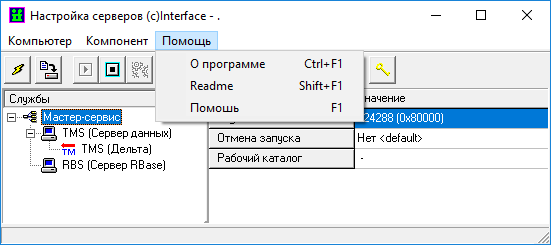 Общее описание настроек и действий, активируемых через пункт главного меню «Компонент» и «Помощь» приведено в таблицах:
