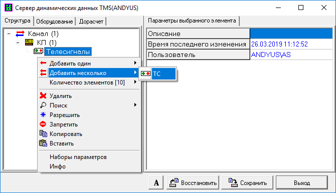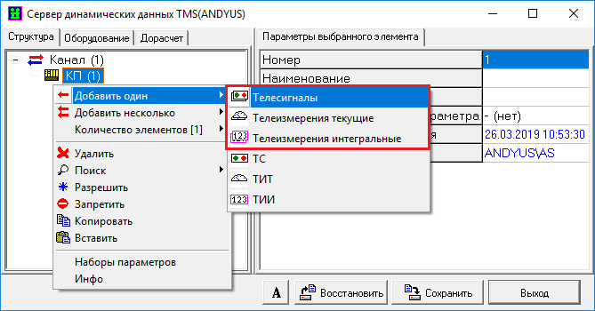 Для добавления объектов, необходимо выделить ЛКМ параметр КП либо параметр ранее созданной группы объектов, нажать ПКМ и в появившемся окне выбрать пункт «Добавить один» и выбрать необходимый тип объекта (ТС,ТИТ,ТИИ).