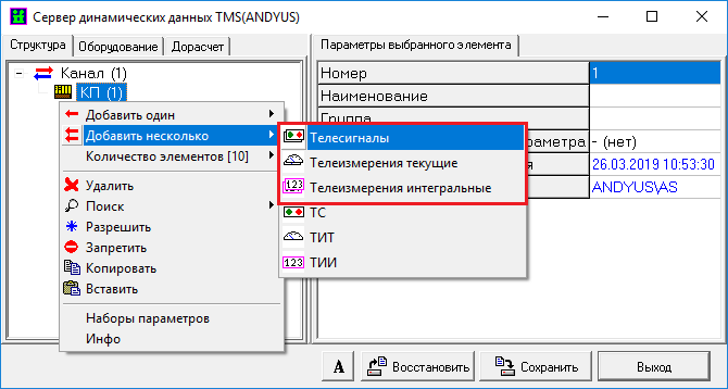 Для добавления большого количества объектов, необходимо выделить ЛКМ параметр КП либо параметр ранее созданной группы объектов, нажать ПКМ и в появившемся окне выбрать пункт ««Количество элементов [1]» и выбрать необходимый тип объекта (ТС, ТИТ, ТИИ).