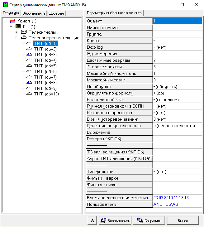 Описание объекта вводится на уровне иерархии - КП. Допускается ввод описателей групп телепараметров (телесигналов, телеизмерений текущих, телеизмерений интегральных) и собственно самих телепараметров (ТС, ТИТ, ТИИ). Описание объектов ТУ выполняется в разделе 14.2 «Настройка оборудования». Разбиение телепараметров на группы условное, но рекомендуемое. При описании групп телепараметров обязательных для настройки параметров нет.