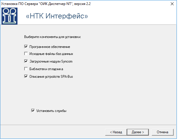 Компоненты, предлагаемые для выбора при установке сервера «ОИК Диспетчер НТ»:
