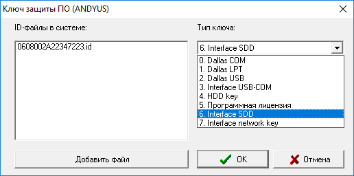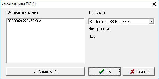 6. Interface USB HID/SSD - данный тип ключа, используется при наличии аппаратного ключа защиты, который подключается в USB - порт компьютера. Номер id-файла таких лицензий должен начинаться с цифр 06...id. На аппаратном ключе должен быть отображен номер из 16 символов, полностью совпадающий с именем id-файла.