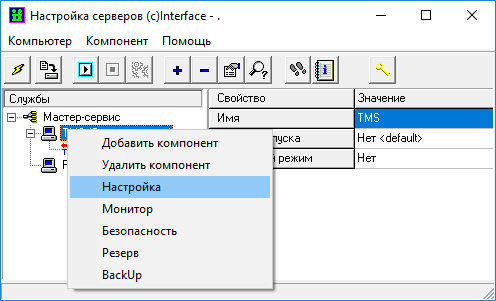 10.3 Перейти в окно настройки сервера динамических данных TMS, для чего ЛКМ выбрать TMS (сетевой сервер), затем ПКМ вызвать дополнительное меню, в котором ЛКМ выбрать пункт меню «Настройка». Альтернативный способ перехода в окно настройки сервера TMS - воспользоваться кнопкой