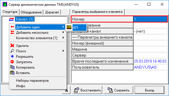 После добавления канала обязательно указать параметр «Номер» - «1». Выделить в поле вкладки структуры параметр «Канал», нажать ПКМ на данный параметр, в появившемся окне выбрать пункт «Добавить один» - «КП».