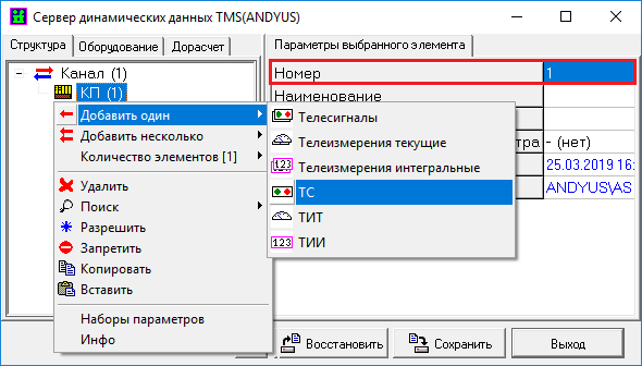 После добавления КП обязательно указать параметр «Номер» - «1». Выделить в поле вкладки структуры параметр «КП», нажать ПКМ на данный параметр, в появившемся окне выбрать пункт «Добавить один» - «ТС».