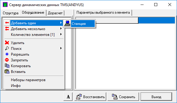 Нажать ПКМ на белое поле вкладки «Оборудование», в появившемся окне выбрать пункт «Добавить один» - «Станция». Добавленному элементу «Станция» заполнить параметр «Имя» - «.» (точка).