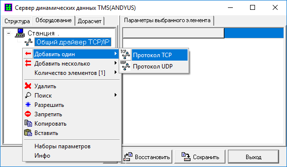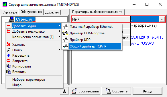 Выделить в поле вкладки оборудования параметр «Станция», нажать ПКМ на данный параметр, в появившемся окне выбрать пункт «Добавить один» - «Общий драйвер TCP/IP».
