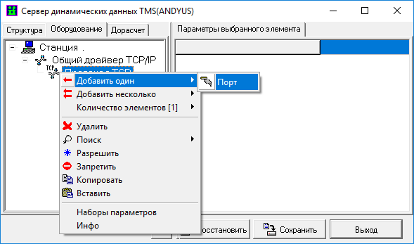 Выделить в поле вкладки оборудования параметр «Протокол TCP», нажать ПКМ на данный параметр, в появившемся окне выбрать пункт «Добавить один» - «Порт». Добавленному параметру «Порт» обязательно указать «Номер порта» - «1»