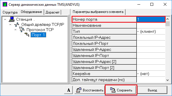 10.3.2 На вкладке «Оборудование» сервера динамических данных TMS настроить параметры источника телеметрии. Подробное описание параметров настройки сервера динамических данных на закладке «Структура» приведено в разделе 14.2. Примеры настроек сервера динамических данных приведены в Приложении А.