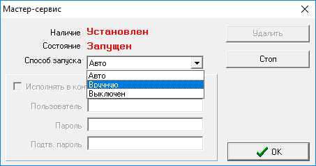 10.4 Данный пункт предназначен только для версии 2.Х. Настроить способ запуска Master-сервиса (выбрать строки меню «Компьютер» ->«Способ запуска мастер-сервиса …» или воспользоваться кнопкой
