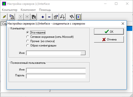 В появившемся окне, необходимо определить к какому серверу будет производиться подключение. Если «Настройка серверов» и ПО сервера «ОИК Диспетчер НТ» установлены на одном компьютере, то необходимо выбрать следующие параметры подключения: «Эта машина», в поле имя указать «.»(точка)