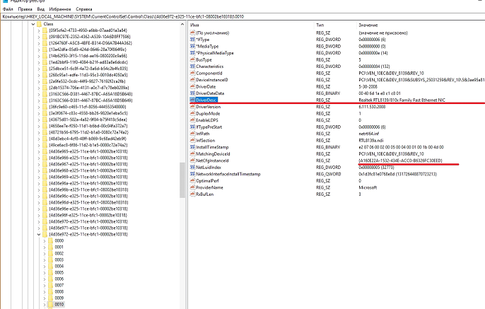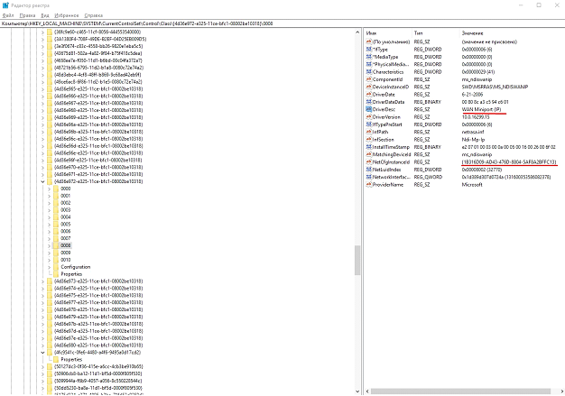 Компьютер\HKEY_LOCAL_MACHINE\SYSTEM\CurrentControlSet\Control\Class\{4d36e972-e325-11ce-bfc1-08002be10318} рис.2 в нашем случае устройство по адресу 0, находится в каталоге 0008, в нашем случае это "WAN Miniport (IP)"
