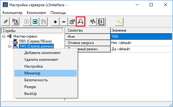 Для перехода в окно «ТМС-монитор» сервера динамических данных необходимо в окне главного меню программы «Настройка серверов» ЛКМ выбрать строку сервера динамических данных (по умолчанию - «TMS (Сетевой сервер)») и ЛКМ нажать на кнопку